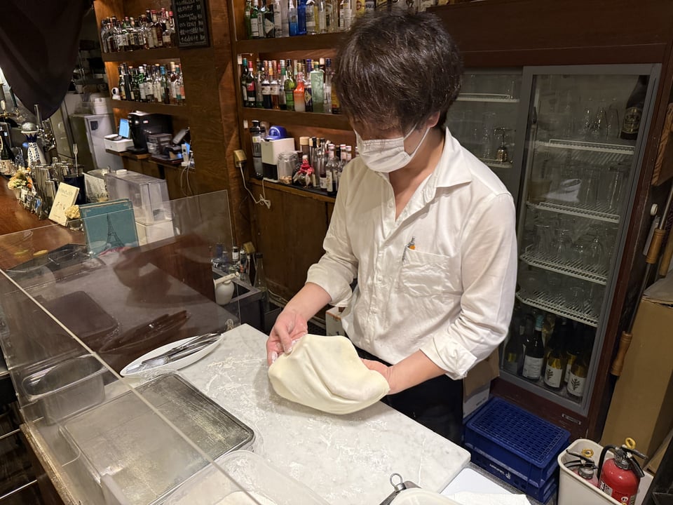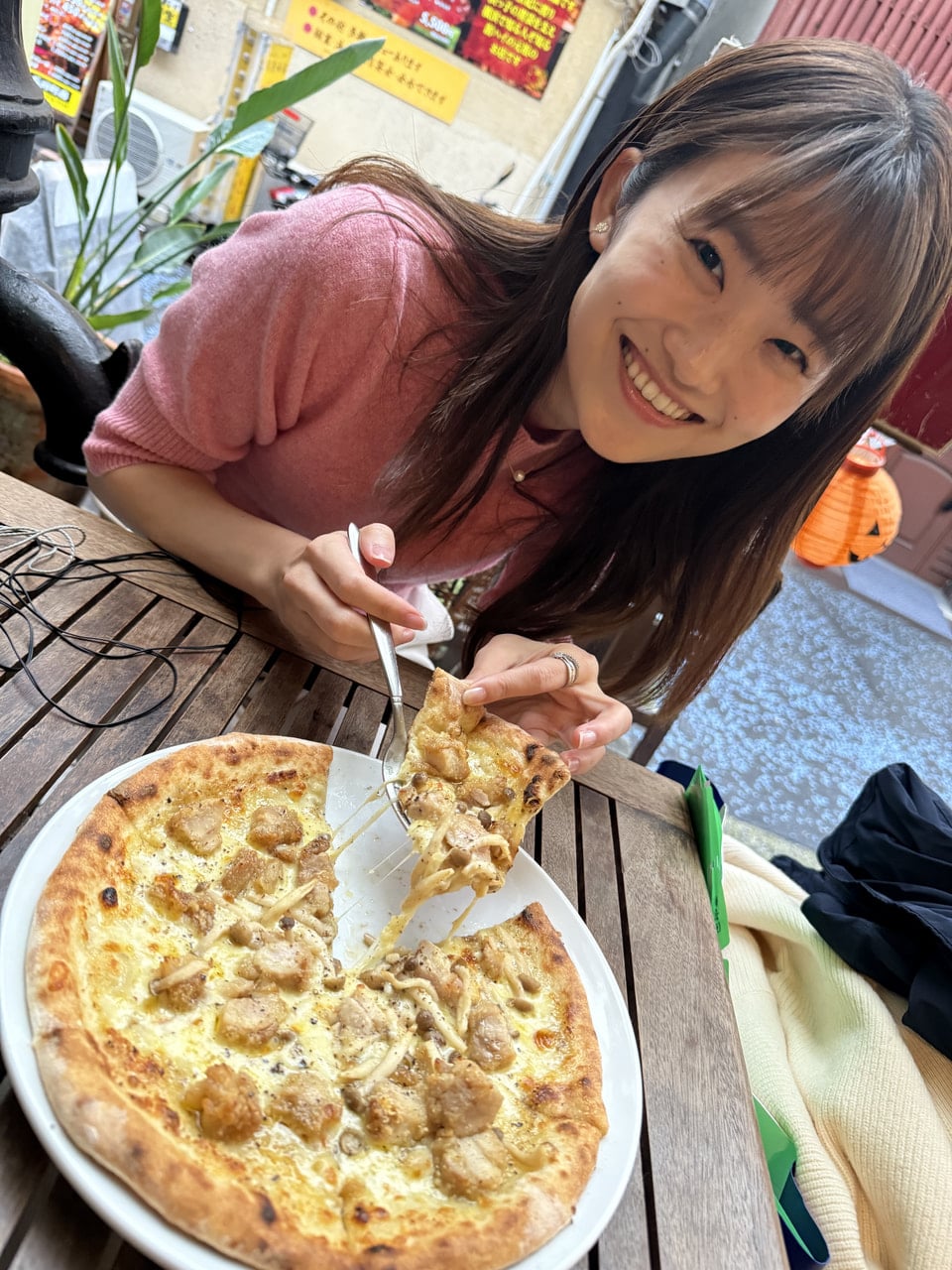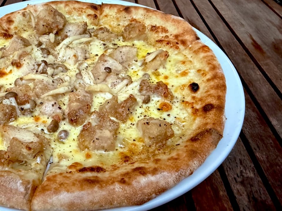 自家製の生地が目の前でこねられ、丸く形作られ、アンチョビ入りのガーリックソースに、きのこと、生姜などでした味がついているチキン、そしてチーズがトッピングされます。そのまま窯の中へIN!焼きたてチーズジュワジュワの一枚が出てきた頃には、手が伸びてペロリ。おいしー!