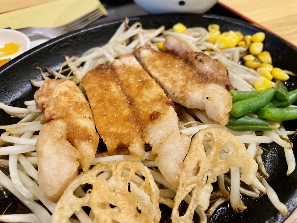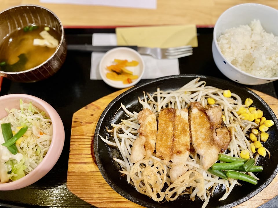 地産地消の「はまポーク」のロース肉135gを使った定食メニュー。ガーリックのどっしりした味わいが、豚肉の脂と絡み合い、幸せな味になりました。熱々の鉄板でやってくる、トンテキは目にも嬉しい一品です。ご飯は、新米です。お味噌汁とサラダ、お漬物も付いてます。