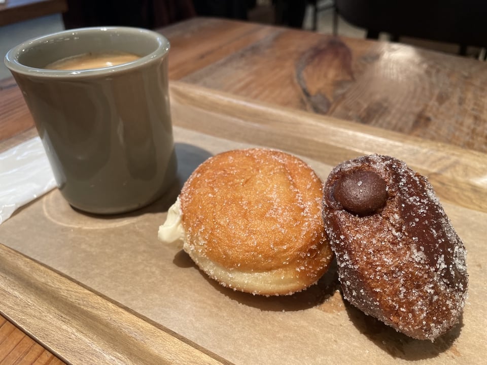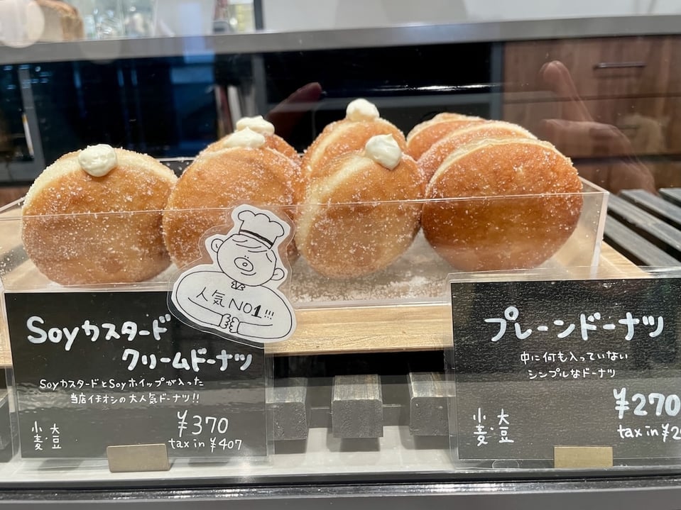 コロンとしたフォルムの中には、口当たり軽やかだけど、食べ応えのあるクリームが。豆乳の優しい香りが引き立ちます。全体にまぶされているのは、「てんさい糖」です。甘さ控えめで美味しい🤤(写真左側のドーナツです。)