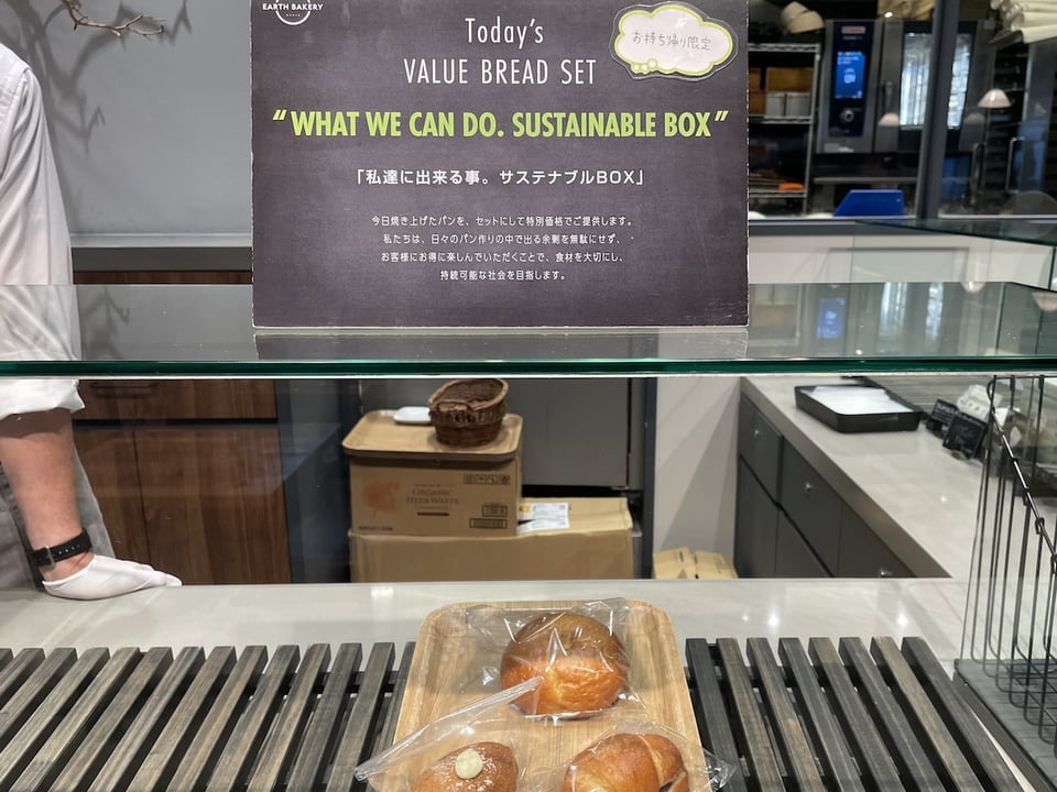 環境に優しい取り組みとして、まずは「私達に出来る事。サステナブルBOX」を教えてくださいました。これは、平日の夕方に開催。今日焼き上げたパンをセットにして、特別価格で提供して下さいます。パンを余らせることなく、お客様にも喜んで頂ける取り組みをされています。