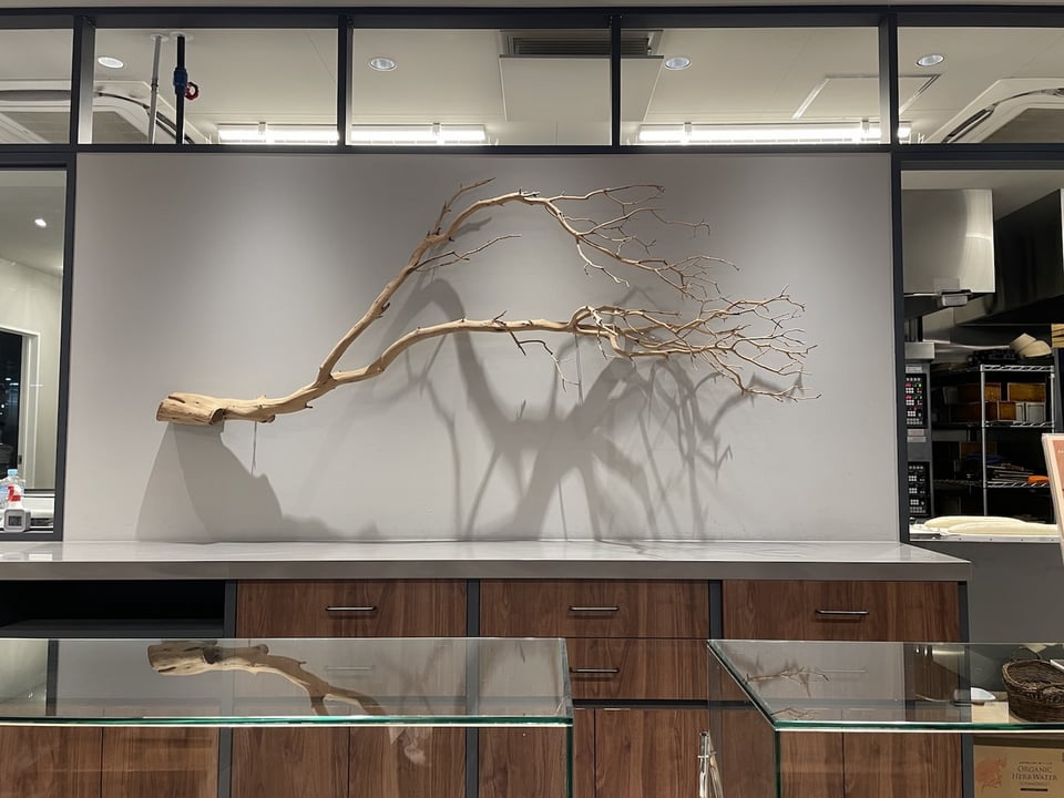 さらには、「古材を活用したインテリア」を使用。店内のテーブルの木材、そしてお店のカウンターの後ろに飾られている「シンボルツリー」などは、古材を可能な限り活用しています。材料を無駄に使用せず、循環できるものは活用しています。