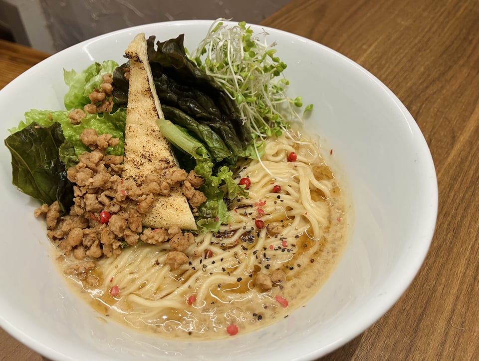 スープはまるでポタージュのようにクリーミーでソイミートとピンクぺっパーが良いアクセントに。