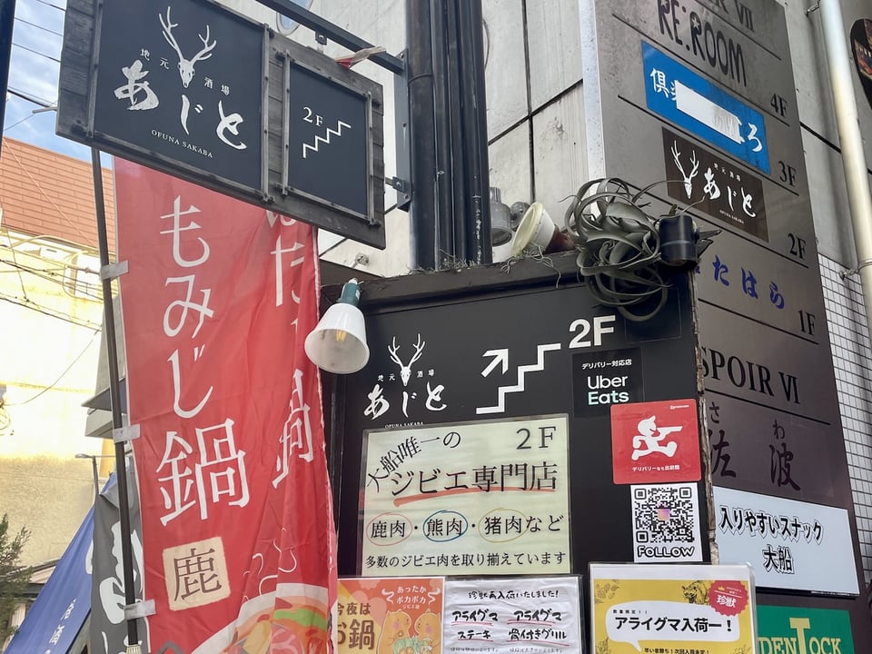駅を出て商店街を進み少し路地に入ると目に入るビルの2階。建物の前には、「熊肉あります」とか「アライグマ入荷しました」といった貼り紙も。そうです、ここはジビエ専門店なのです。