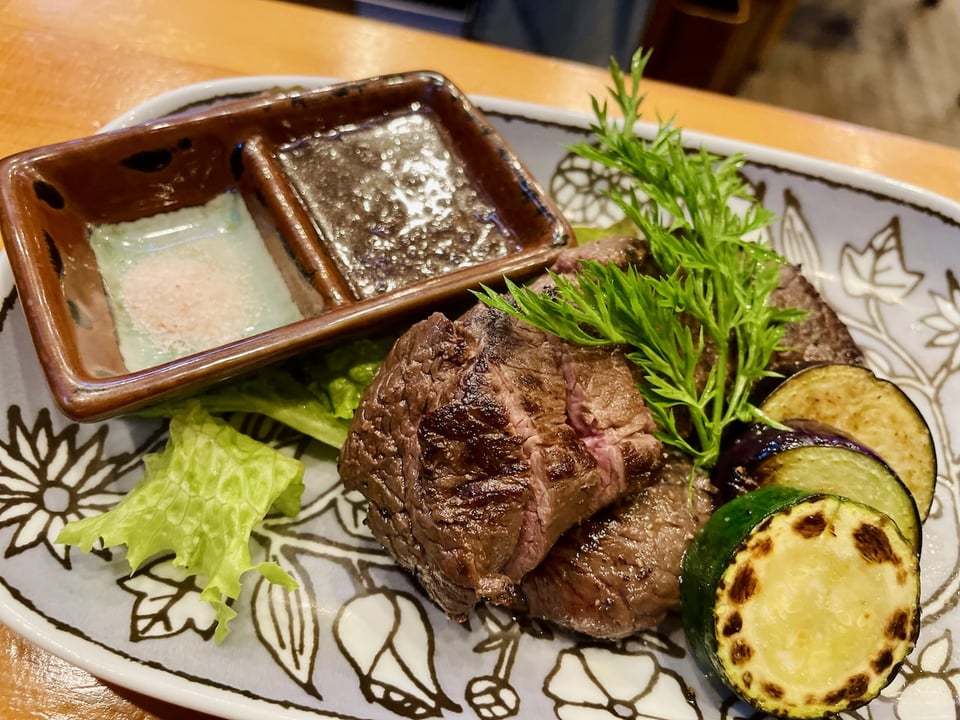 赤身の多い部位なのでヘルシー。肉のおいしさを感じてもらえる、シンプルなステーキ。塩と自家製シャリアピンソースの2種で楽しめます!塩ならお肉の味わいを存分に。シャリアピンソースは、玉ねぎとニンニクの味わいも美味しい。どちらも最高◎