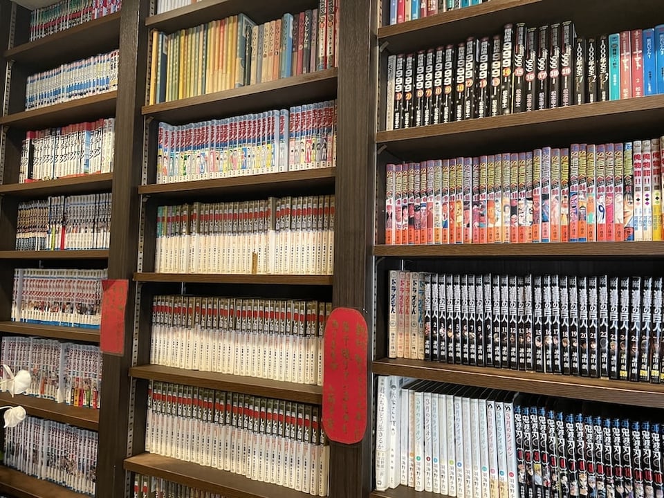 お店は、カウンター10席でオープンキッチンで、ステーキやハンバーグなどが楽しめます。お店のカウンターの横にはズラリと並んだ漫画が。なんと1500冊はあるそうです!