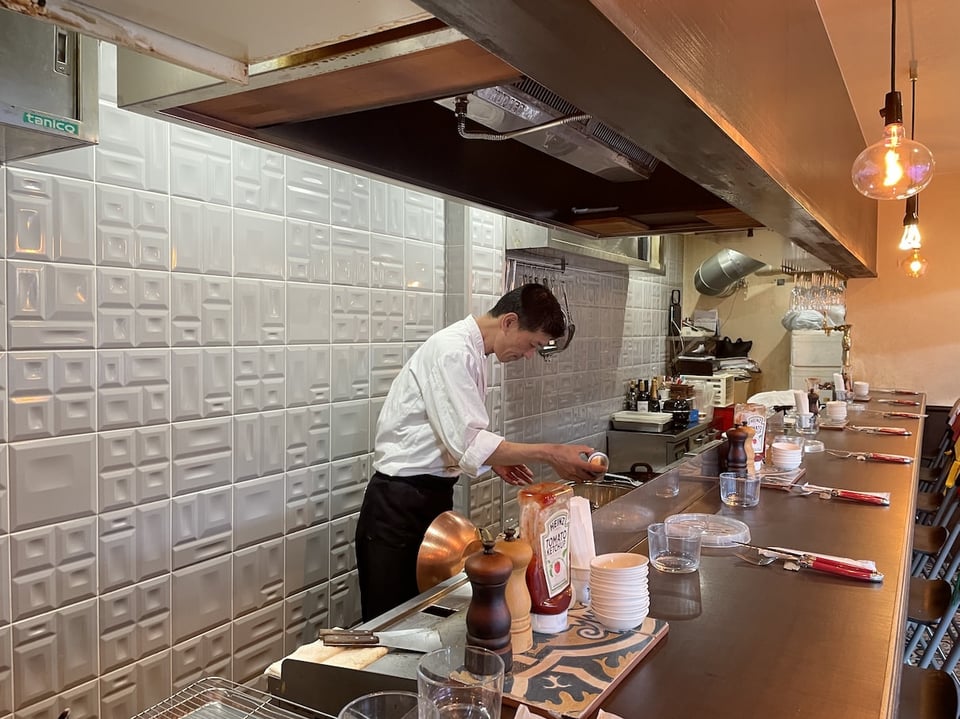 お肉の良い匂いに期待を膨らましながら、付け合わせで出てくる山盛りフレンチフライを片手に、漫画を読んでお料理を待つ。というのがこのお店のスタイルです。オープンキッチンで準備する笹野さんの手際の良い姿を見ているのも楽しいですよ。