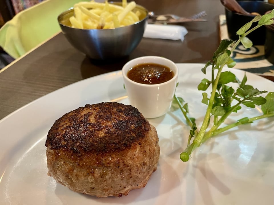目の前で焼いてもらうハンバーグ。お肉を焼く前に整える音も軽快で心弾みます。お肉ふっくらで、ナイフを入れると流れ出す肉汁が最高。口に入れると、肉汁が全身に染み渡るようで、本当に幸せ。今回は、玉ねぎソースをご用意いただきました。