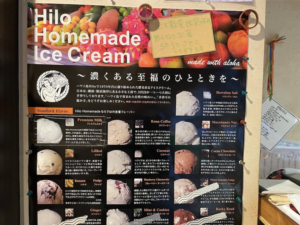 お肉はもちろんですが、アイスも名物。ハワイ島生まれのプレミアムアイス、Hilo Homemade Ice Creamが食べられます。こちらのアイス、実は5代目店主が鵠沼海岸の小さな工房で手作りされているんです。