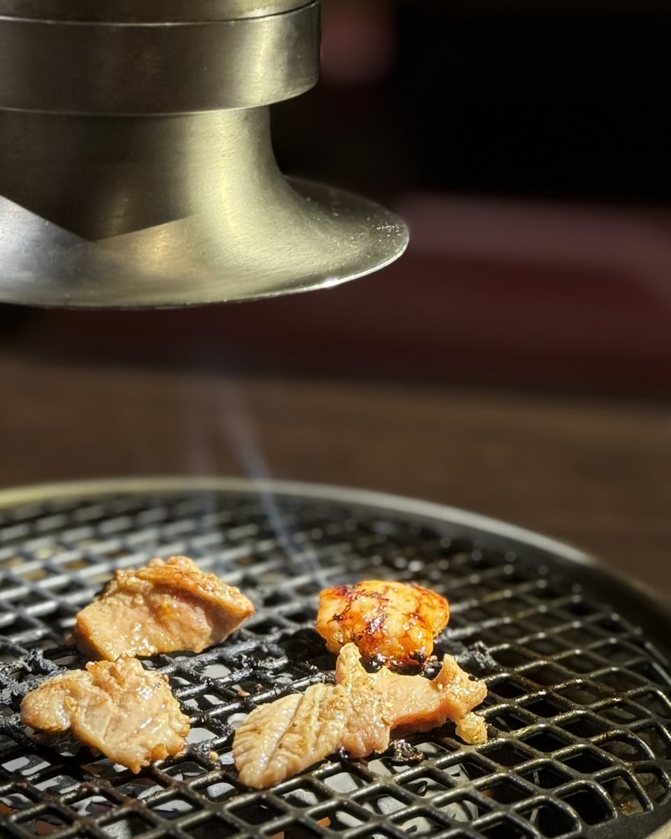 スポットライトのある網の上で焼き上げたお肉たち。肉汁も相まってよりキラキラして見えます。お店で下処理, カッティングもしているので、より新鮮で、大きい身を頂けます。
