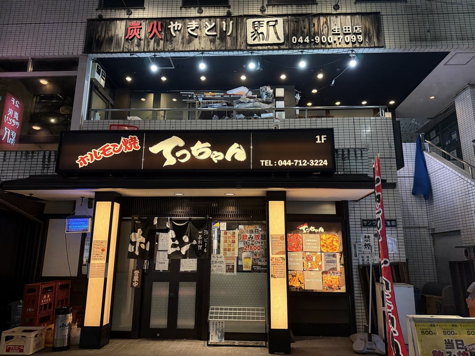 生田でお肉食べるならここ!【ホルモン焼 てっちゃん(1F) / 炭火やきとり駅 生田店(2F)】