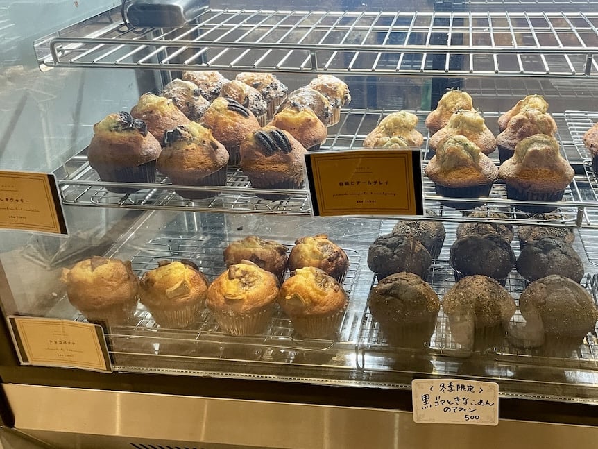 駅近のカフェは、落ち着いているけど温かみもある、いわゆる「くすみカラー」のオシャレな雰囲気です。お店のコンセプトは「昼はマフィン、夜は日本酒」のハイブリッドカフェ。お店に伺った時間はマフィンのケースの横にあるカウターで常連さんが夜のお通しを食べてました!
