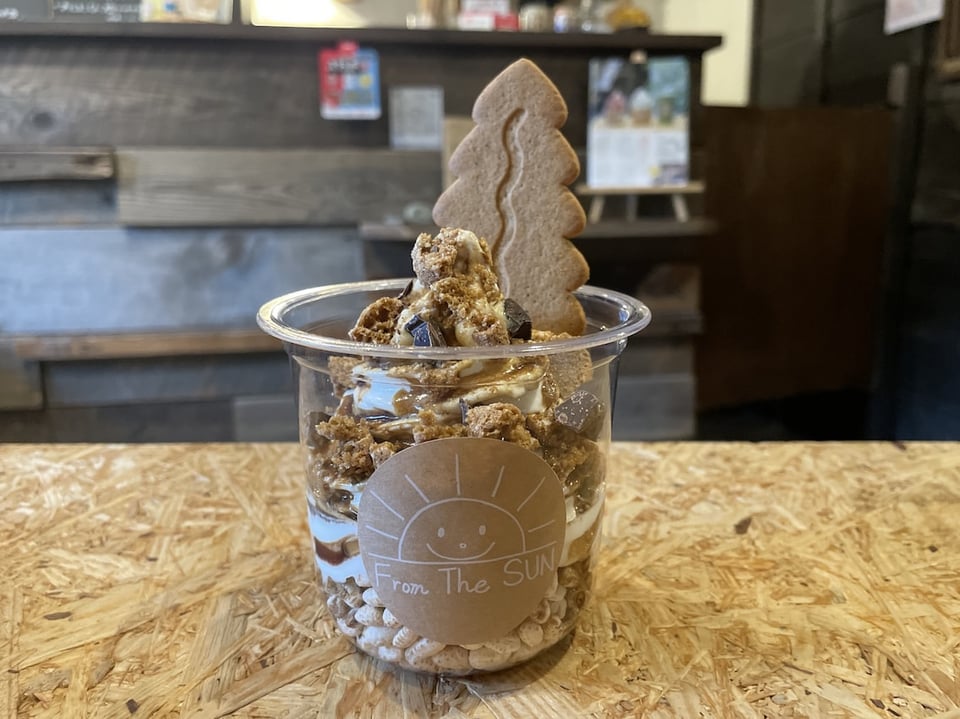 今週末からの新商品「コーヒービスケットパフェ」がスタート。ミルキーな味わいに、コーヒーの苦味が重なる大人のパフェ。さらにチョコのアクセントがポイント。(フレーバーはぜひ食べて当ててみてね!)ライスパフの土台が柔らかな舌触りで、美味しいですよ!