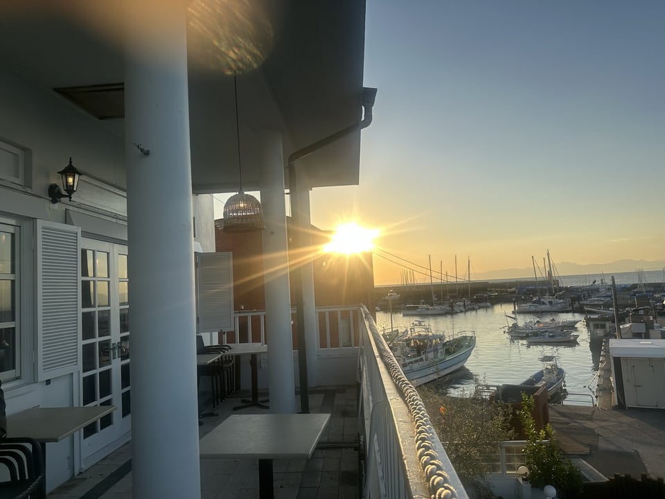 ヨット越しに沈む夕日を見てからお店に向かうなんて