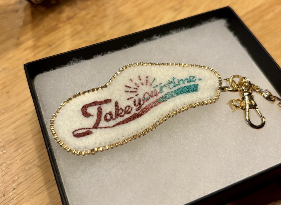 武居がいただいたTake your time.のロゴを模した刺繍作品のほかに、