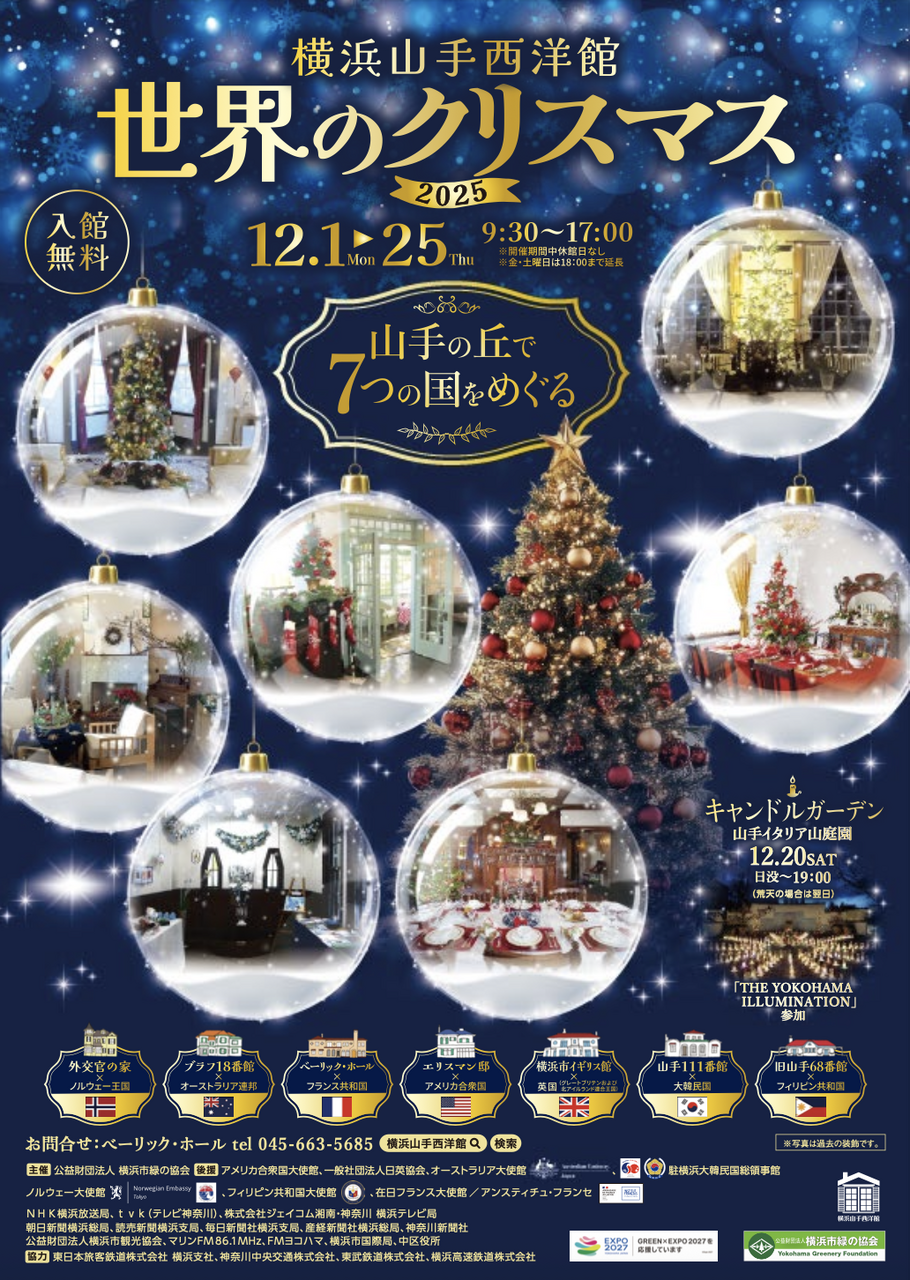 内藤>いいですね~!など、今日は12月1日から25日まで横浜山手地区で開催されている「横浜山手西洋館 世界のクリスマス」についてご紹介します。今年のイベントのテーマは「山手の丘で7つの国をめぐる」です。アメリカ、イギリス、フランス、オーストラリア、ノルウェー、韓国、フィリピンの7か国のクリスマス装飾と文化を山手西洋館6館と旧山手68番館で楽しむことができます。花や緑をふんだんに使った装飾が施されていて、どれも見応えたっぷりです。