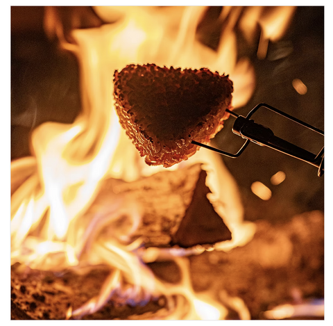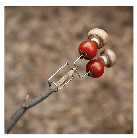 『焚き火の炎で棒に刺した食材を