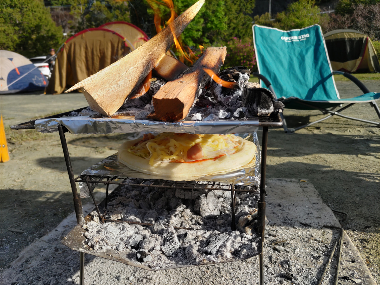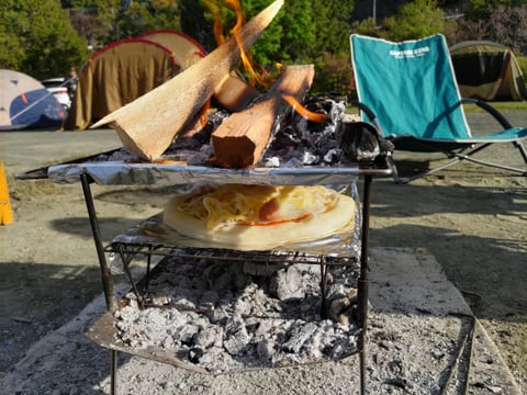 天面の五徳の間に網を置いて簡易ピザ窯にしています。