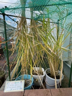 ・・ホッとした束の間、次は冷害です。急に秋らしく、涼しい朝晩を迎えるようになって数日後、また稲が元気をなくしてしまいました。鳥害対策に掛けてる網が洗濯ネットのせいか、それが日陰にしてしまったのもあるのか…?小鳥さん達の目が気になりますが、ここはイネリンコを元気にすることが大事と考え、思い切って網を外しました。日差しをタップリ浴びたイネリンコは、またまた元気に、稲の粒々を膨らましてくれました。