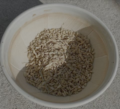 すり鉢と軟式ボールで脱穀