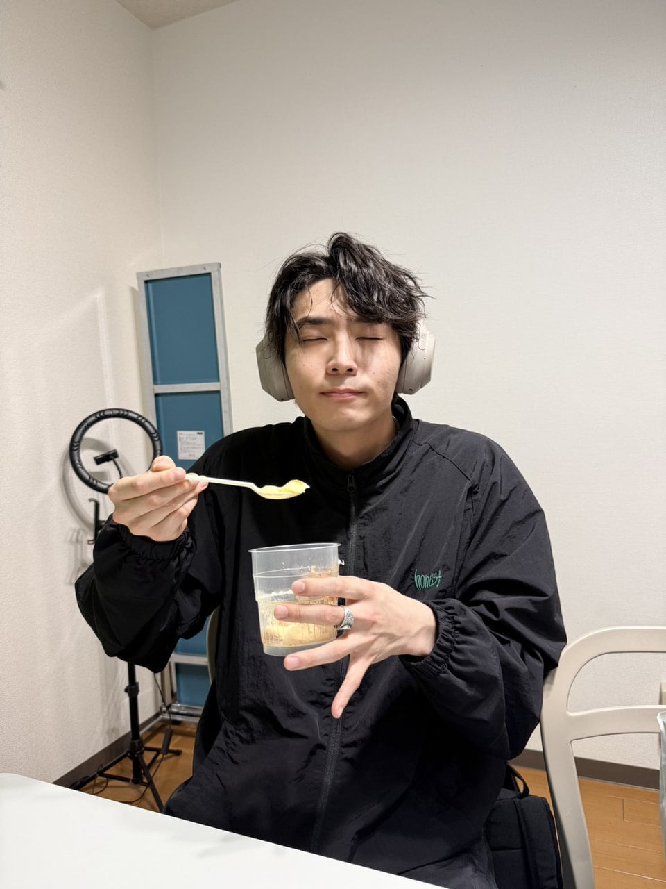 「ラジオ終わりにラーメン一緒に食べた時。油ましましニンニクめっちゃ食ってるREIJIくん」