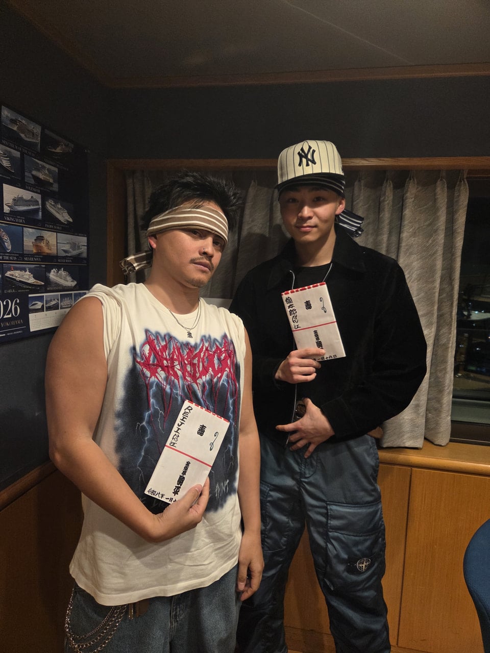 筋肉を見せつけているREIJIくんとラッパー風倫太郎